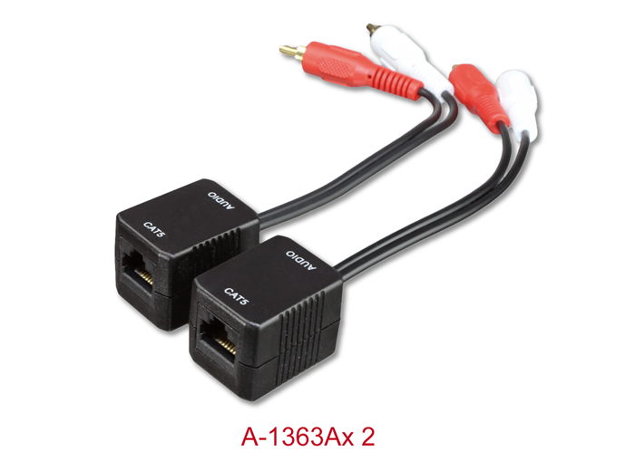 Cable adaptador de audio que utiliza conectores RJ-45 (CAT5) en un extremo y conectores RCA en el otro. Este cable se utiliza para transmitir audio estéreo, conectando la salida de audio de una fuente (como un reproductor de CD o un amplificador) a la entrada de audio de un dispositivo de salida (como altavoces o un receptor de audio).